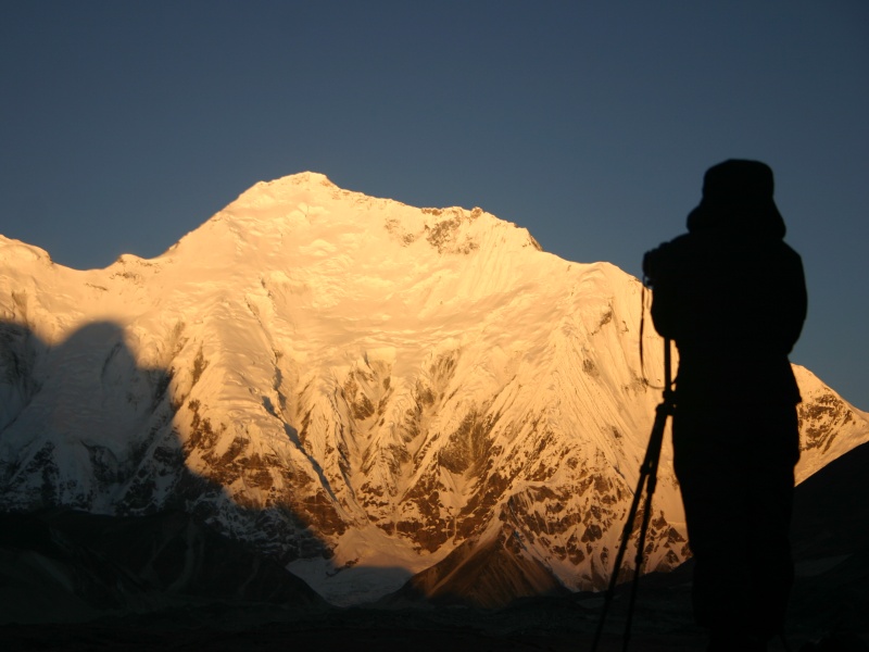 Clients trekking in the Kharta Valley taking photos of the sunrise at East Face of Everest